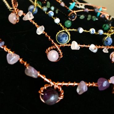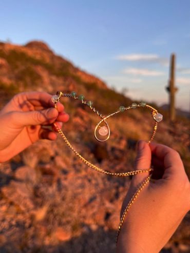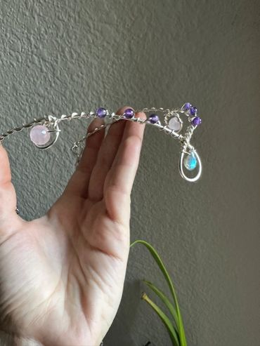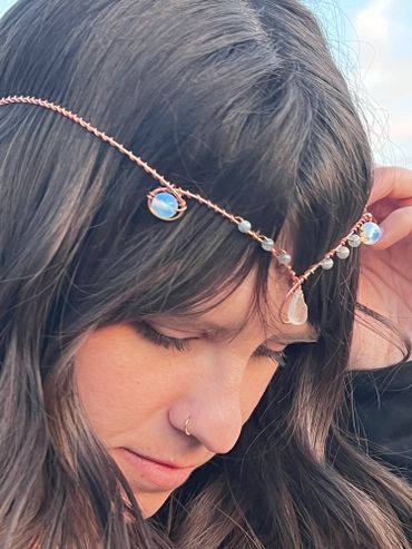 This is one of my most loved designs. Featuring a single layer of wire delicately wrapped together featuring a center stone, crystals on the forehead, and temple details as well. Crystals can be customized and it comes in copper, gold colored brass, silver plated, and solid sterling silver. The back of the crown has a lobster clasp and a chai for a custom fit. Can be worn on the front