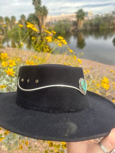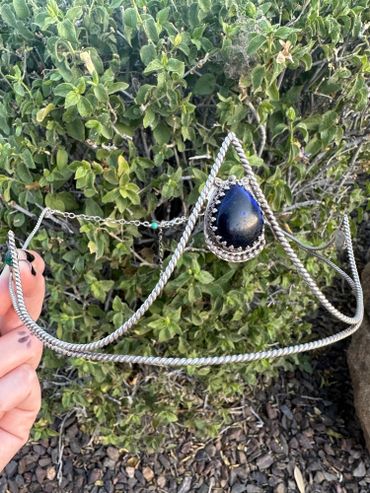 A simple, elegant design that is soldered together and makes a statement. Handcrafted using solid sterling silver and featuring a center stone of your choosing. This design hugs the curves of the head with no need for chains, but they can be added upon request. All silversmithed pieces are stamped with the year and my artist mark ~ MDD